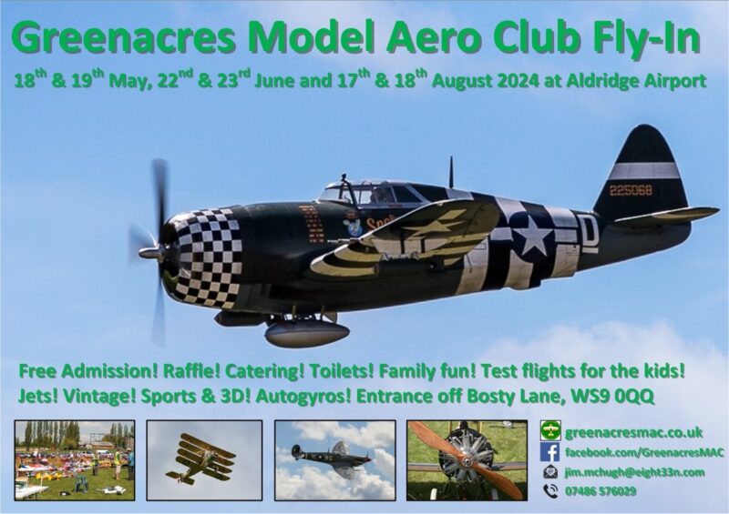 An open fun fly event for all club pilots with an A cert. All classes, styles, types and disciplines welcome. Campers and caravans can arrive after 1:00PM on the Friday before. Water, Portaloos, raffle and catering are all available, for a small donation. Location is WS9 0QQ, off Bosty Lane, in Aldridge near Walsall, and follow the signs onto the park. Visiting pilots fly for £5 per day, but spectators and the public are free! If you have any special requests or requirements, please contact: Jim Mchugh at jim.mchugh@greenacresmac.co.uk See you there!