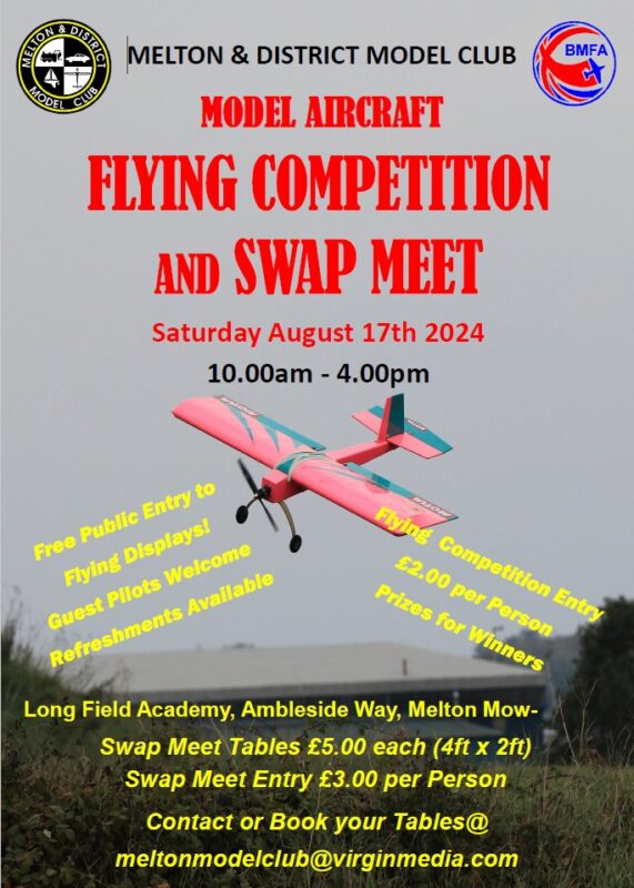 Flying display, FunFly Competition and Swap Meet from 10.00am to 16.00pm Saturday August 17th 2024 at the Long Field Academy, Ambleside Way, Melton Mowbray LE13 0BN.